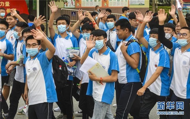 7月8日,在福建省福州教育学院附属中学考点,考生和同学挥手告别。 当日,全国部分地区2020年高考结束。 新华社记者 宋为伟 摄