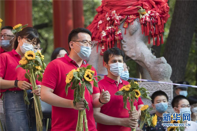 7月8日,在黑龙江省哈尔滨市第三中学考点外,老师拿着向日葵迎接考生。 当日,全国部分地区2020年高考结束。 新华社发(张涛摄)