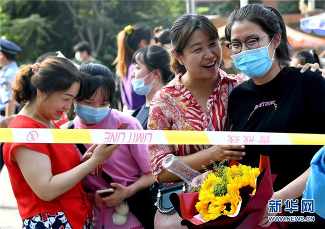 7月8日,吉林省长春希望高中考点的考生接过家长手中的花束。 当日,全国部分地区2020年高考结束。 新华社记者 张楠 摄