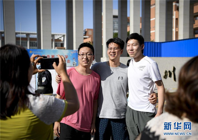 7月8日,在重庆市徐悲鸿中学考点,考生在考试结束后在校门口合影。 当日,全国部分地区2020年高考结束。 新华社记者 唐奕 摄
