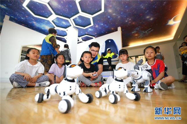 7月12日,小学生在山东省青岛市即墨区环秀街道滨湖社区科普馆与机器人互动。新华社发(梁孝鹏 摄)