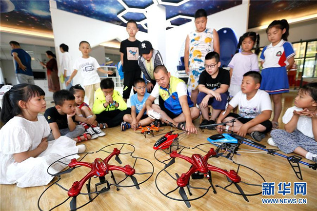 7月12日,山东省青岛市即墨区环秀街道滨湖社区科普馆工作人员在给小学生讲解无人机飞行常识。新华社发(梁孝鹏 摄)