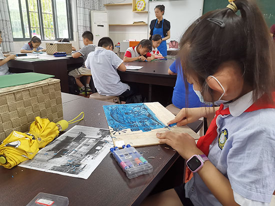 在该校,版画社团就将美育与劳动教育进行了融合。美术老师王帆介绍,版画的创作需经过起稿、印板、刻制、拓印等多个步骤,整个创作过程可以锻炼学生的细心、耐心和逻辑思维。