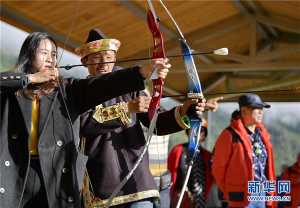 一名游客在当地农牧民的指导下射击响箭(7月26日摄)。新华社记者张汝锋摄