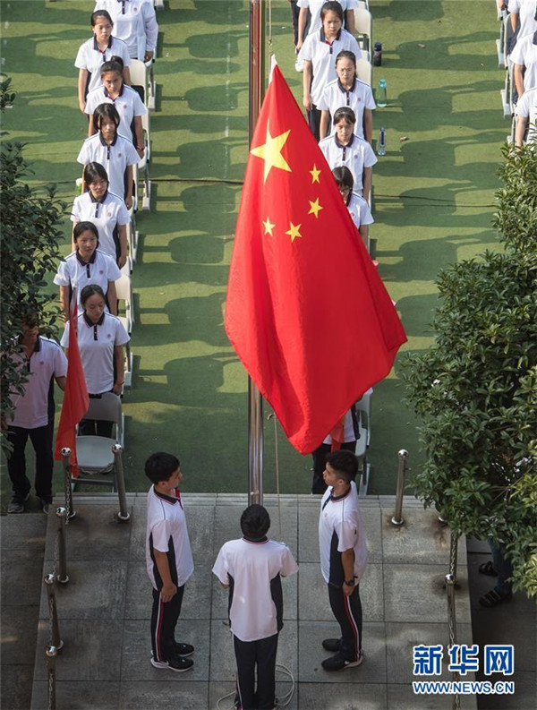 9月1日,武汉中学的开学典礼举行升旗仪式。当日,武汉市2842所中小学、幼儿园迎来开学,涉及学生139.9万人,百万学子重返校园。新华社记者肖艺九摄