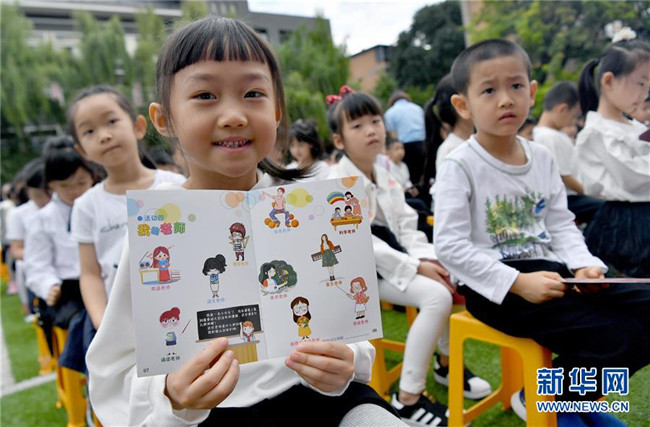 8月31日,西安市新城区后宰门小学一年级新生在开学典礼上展示自己的“入学护照”。 当日,陕西西安市的多所中小学迎来秋季开学报到。 新华社记者 刘潇 摄