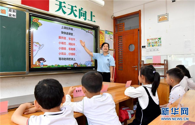 8月31日,西安市新城区后宰门小学向日葵班的老师在给一年级新生讲解上课规则。 当日,陕西西安市的多所中小学迎来秋季开学报到。 新华社记者 刘潇 摄
