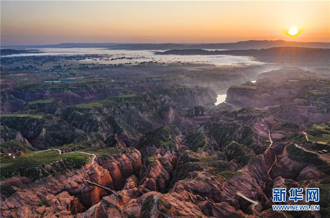 一轮红日照耀着靖边县龙洲镇波浪谷丹霞景区(9月24日摄,无人机照片)。新华社记者 陶明 摄