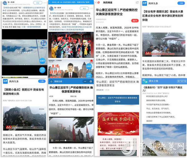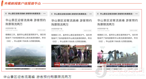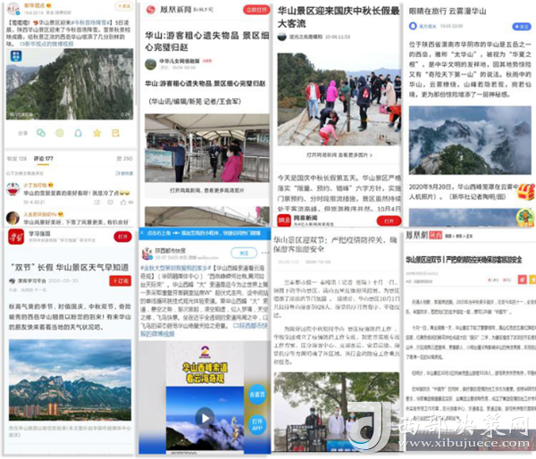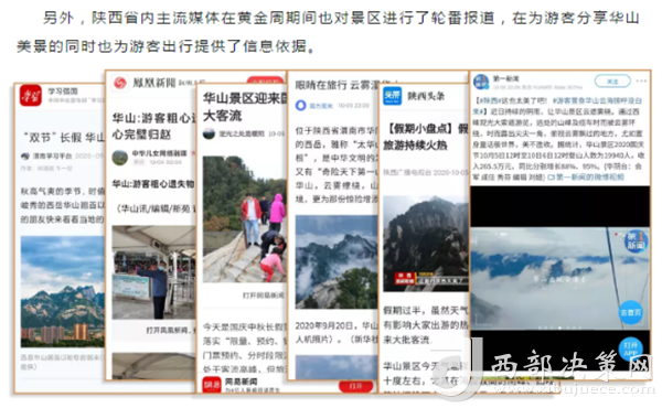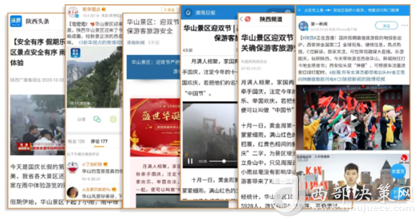 度节期间,通过央视cctv2【天下财经】、cctv4、cctv13【新闻30分】、cctv13【新闻直播间】、央视网【国庆假期·出游】、央视网学习强国、央视新闻客户端、新华社等国家级媒体对景区度节工作、游览秩序、特色服务等方面进行轰炸式报道;联合陕西日报、陕西电视台、渭南日报、渭南电视台、三秦都市报、陕西旅游资讯、腾讯网、新浪网、网易陕西、凤凰陕西等30余家主流媒体对景区度节期间各项工作及实时风景进行跟踪报道,共计发布各类宣传稿件239篇,全面提升景区旅游热度。