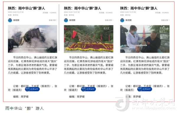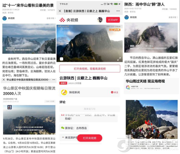 节前与央视频手机客户端及陕视新闻手机客户端提前对接并测试信号,确保黄金周期间全天24小时不间断慢直播顺利进行,同时与央视、新华社、人民网、陕西日报、陕西电视台、渭南日报、渭南电视台及省内主流网络媒体联系对接,确保黄金周期间各项工作有序推进。