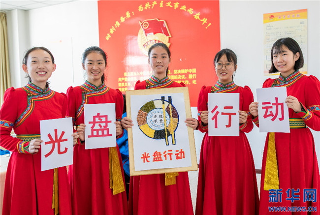 15日,内蒙古呼和浩特市第二十六中学学生展示“光盘行动”趣味粮食贴画。新华网发(丁根厚摄)