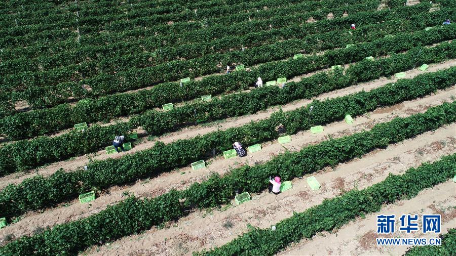 在宁夏银川市永宁县闽宁镇的立兰酒庄酿酒葡萄种植基地,农户在田间采摘葡萄(2019年9月3日摄,无人机照片)。新华社记者 王鹏 摄