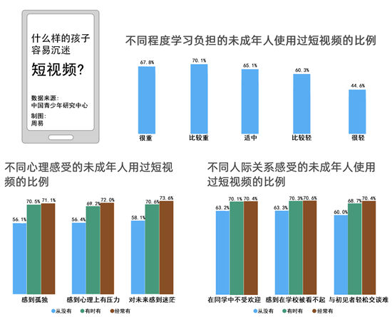 调查同时发现,感到孤独、心理上有压力、对未来迷惘的中小学生接触短视频的比例更高。