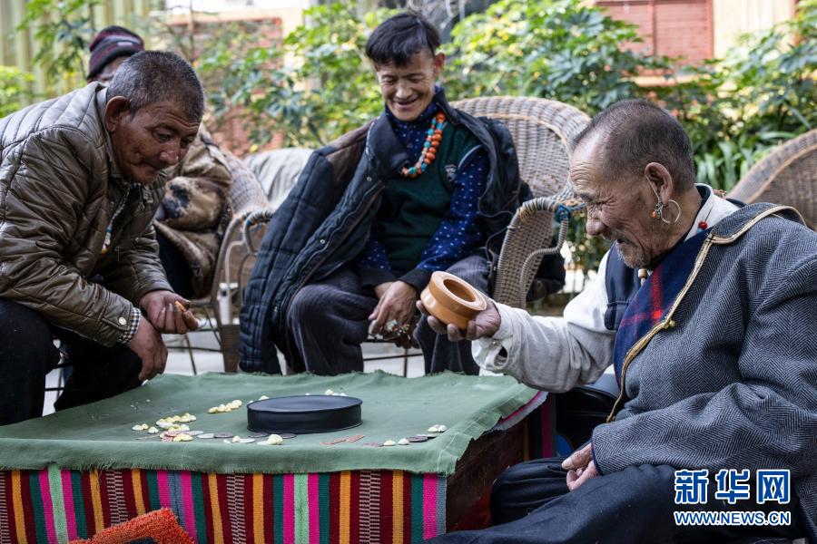 次旦(右)在集中供养服务中心和朋友们一起进行娱乐活动(3月19日摄)。
