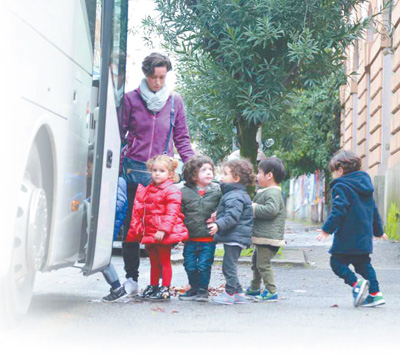 意大利罗马一家幼儿园的小朋友们在老师的组织下登上校车。 本报记者 韩 硕摄