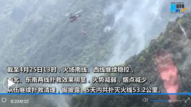 截至4月25日13时,火场南线、西线继续稳控,西北、东南两线扑救效果明显,火势减弱,烟点减少,队伍继续扑救清理,据披露,5天内共扑灭火线53.2公里,扑打明火77处,清理烟点2382处。