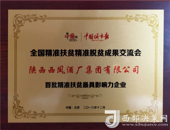西凤集团公司荣获全国“首批精准扶贫最具影响力企业”荣誉称号