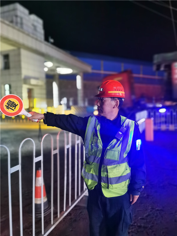 作为销售中心发运区安保人员,安全工作不管在什么时候都丝毫松懈不得,时时刻刻严抓严查安全隐患,保安马文龙正在指挥车辆减速慢行和检查司机是否有酒驾行为。