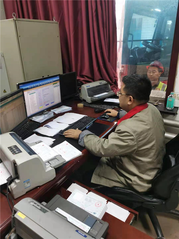 司磅员魏涵正在专心致志进行车辆称重计量打票作业,认真核对车辆信息,确保做到过磅速度快,票据准确无误。