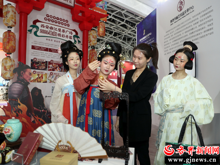 在第五届丝博会陕文投集团展区,身着汉服的工作人员向观众介绍文创产品。 记者 杜静波 摄