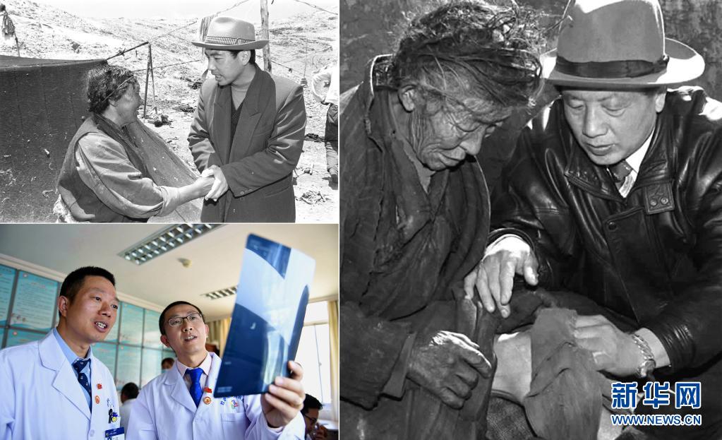 这是一张拼版照片:左上图为来自陕西的援藏干部阿里日土县副县长贾冗勇深入牧区,帮助藏族牧民解决生产、生活的实际困难(新华社记者土登摄 1997年11月11日发);左下图为2017年8月3日,北京积水潭医院援藏医生龚晓峰(右)和北京天坛医院援藏医生李家谋在拉萨市人民医院骨科病房内查看患者的X光片,进行工作交接(新华社记者晋美多吉摄);右图为孔繁森(右)在阿里日土县过巴乡为孤寡老人益西卓玛治病(新华社记者土登摄 1994年12月26日发)。新华社发