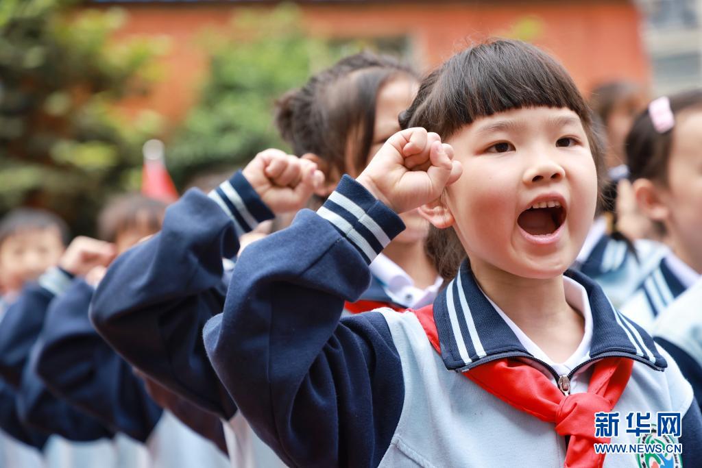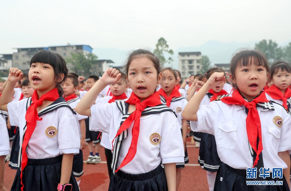 5月31日,四川省华蓥市高兴镇小学少先队新队员在入队仪式上宣誓。新华社发(邱海鹰 摄)