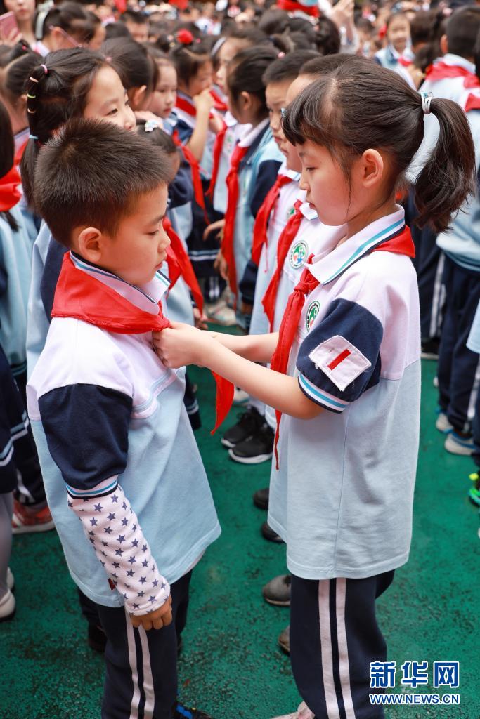 5月31日,高年级的少先队员在入队仪式上为新入队的同学系红领巾。新华社记者 刘续 摄