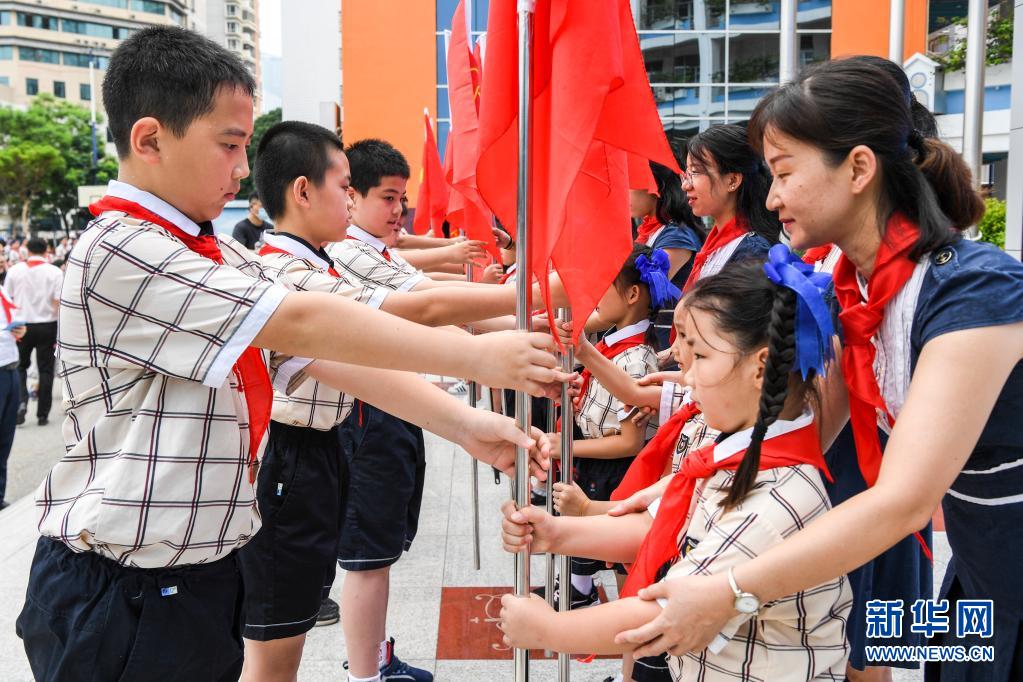 当日,广西南宁市滨湖路小学举行“红领巾心向党 争做新时代好队员”为主题的少先队员入队仪式,一年级学生在“六一”前戴上红领巾,光荣加入中国少年先锋队。