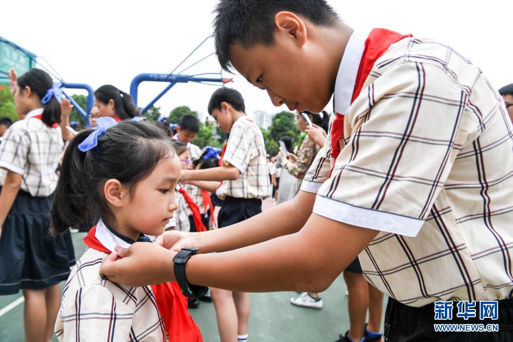 5月31日,南宁市滨湖路小学高年级的少先队员在入队仪式上为新入队的同学系红领巾。新华社记者 曹祎铭 摄