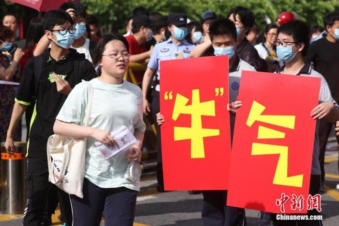 6月7日,江苏省南京市雨花台中学高考考点前,高二的学生手举“牛气冲天”“牛转乾坤”字样为考生加油鼓劲。 中新社记者 泱波 摄