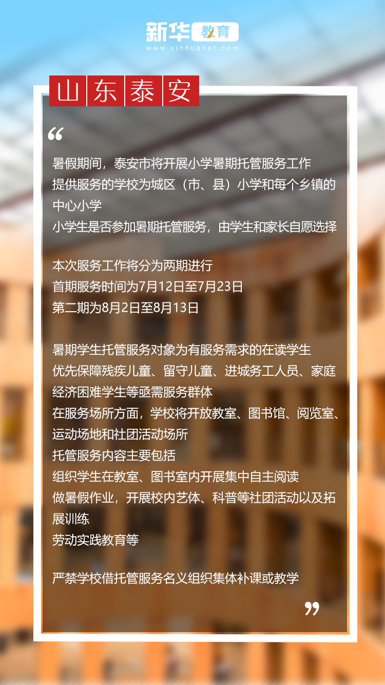 和上海市的做法类似,北京、武汉等地,也发挥资源优势,积极志愿为学生提供暑期托管服务。与此同时,北京明确要求“不组织学科培训和集体授课”;上海明确暑托班坚持“公益、自愿”原则;山东泰安也提出“对家庭条件困难的学生,将免收服务费用”,这些做法在给予家长更多选择的同时,也进一步为家长减轻了育儿成本。