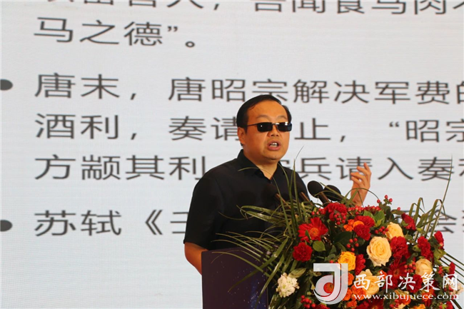 陕西师范大学历史文化学院教授、博士生导师于赓哲教授以《西凤高飞——讲好中国的酒故事》为题作了酒文化分享。他从穆公赐酒、唐代榷酒、苏轼咏酒、明清烧坊等方面讲述了西凤酒悠久的历史文化,同时对西凤酒的发展提出了思考,他讲到白酒行业的营销要重视文化底蕴、紧抓年轻一代消费者的品味,号召大家要弘扬好西凤酒,讲好中国酒故事。