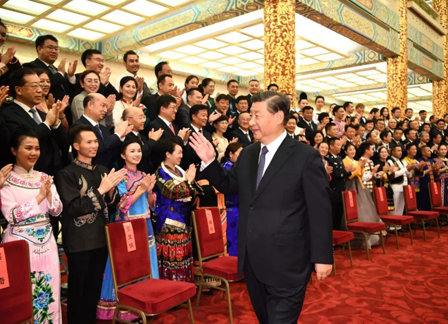 ▲ 8月31日晚,第六届全国少数民族文艺会演开幕式文艺晚会在北京人民大会堂隆重举行。习近平、李克强、汪洋、王沪宁等党和国家领导人出席观看。这是演出开始前,习近平等会见文艺会演演职人员代表、组委会成员、56个民族的优秀基层党员代表等 燕雁摄/本刊