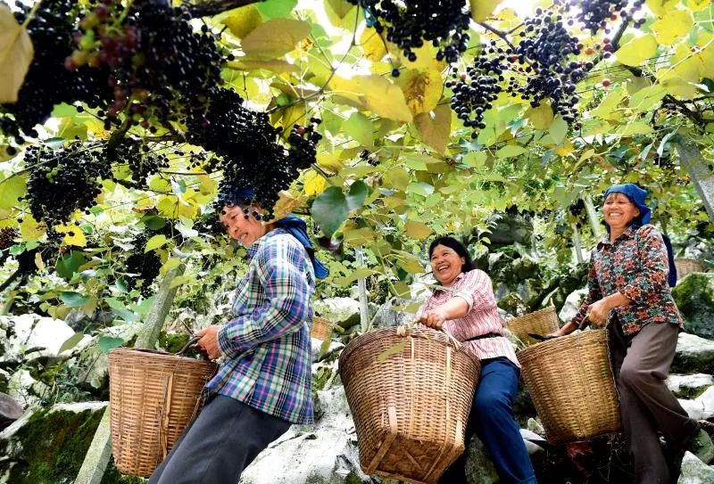 ▲ 9月1日,广西都安瑶族自治县菁盛乡加禾村,当地村民将刚刚采摘的山葡萄搬下山。目前,山葡萄已成为当地农民增收和乡村振兴的重要产业 周华摄/本刊