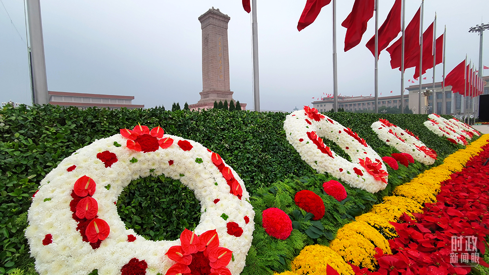 △仪式现场的花坛上镶嵌着18个花环,由白菊、康乃馨等鲜花组成。(总台央视记者王志明拍摄)