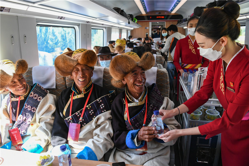 6月25日,全长435公里、设计时速160公里的拉林铁路建成通车,西藏首条电气化铁路建成,同时复兴号实现对31个省区市全覆盖。这是列车员向乘坐首趟复兴号高原内电双源动车组的乘客递水。新华社记者 普布扎西 摄
