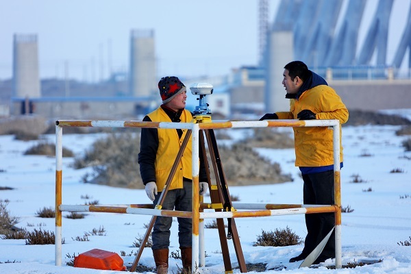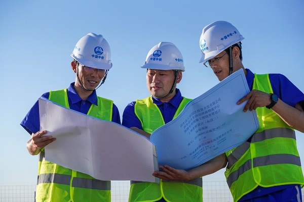 冯兵与同事现场研究图纸,讨论施工方案