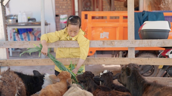 “妞妞合唱团”的成员“粉妞妞”在家中给牛喂草。