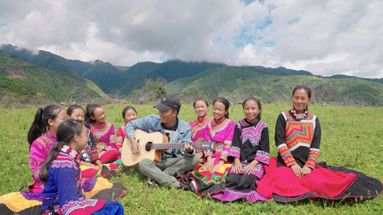 路面因为刚刚下过的雨水变得有些泥泞,走了约半小时的山路后,乡村教师吉布小龙带着合唱团的“妞妞们”坐在山顶草坪上。他用吉他伴奏,9个女孩围着他放声歌唱:“不惧密林深处的豺狼,敢于深海浅滩与蛇蝎作伴……”不远处的青山峰峦起伏,山顶上云雾徜徉。
