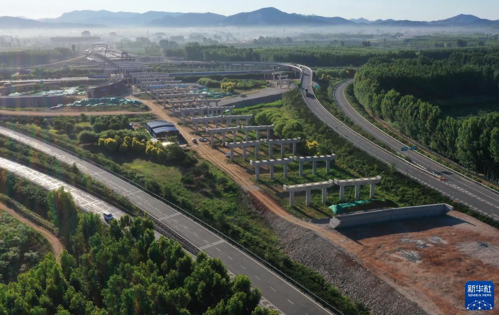这是6月6日在遵化市境内拍摄的京秦高速公路遵(遵化)秦(秦皇岛)段与唐(唐山)承(承德)高速下院寺枢纽互通建设工地(无人机照片)。新华社记者 杨世尧 摄