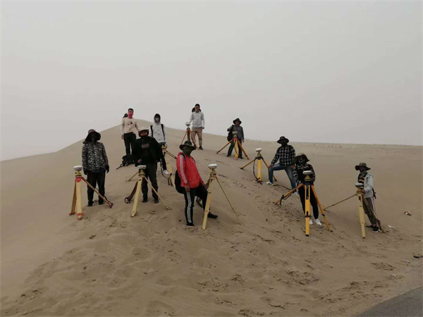 后来,唐飞带领团队又前往新疆若羌,为中铁一局三公司和若铁路项目进行前期控制网复测。项目线路长、地广人稀,且地处塔克拉玛干沙漠边缘。为了节省时间,每天早上他和队员背着馕、咸菜、矿泉水出发,在沙漠戈壁一测就是十二个小时,晚上八九点左右才能回去吃口热饭。有一次,他们在工地上测量时,突遇沙尘暴,他和三个组员赶快收拾仪器,装进仪器箱,四个人围在一起,等着沙尘暴过去。
