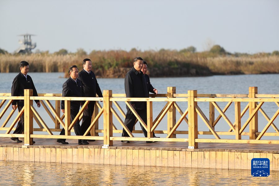 10月22日下午,中共中央总书记、国家主席、中央军委主席习近平在山东省济南市主持召开深入推动黄河流域生态保护和高质量发展座谈会并发表重要讲话。这是座谈会前,习近平20日下午在东营市黄河三角洲国家级自然保护区考察。 新华社记者 李学仁 摄