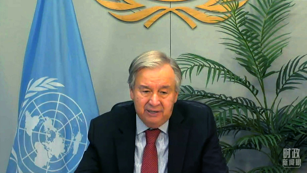 △联合国秘书长古特雷斯通过视频方式发表致辞。