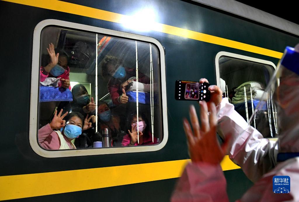 10月29日,滞留游客离开额济纳旗时,在列车车厢里与地面人员告别。新华社发(王磊 摄)