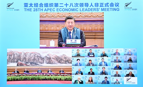 习近平强调,今年是中国共产党成立100周年。让14亿多中国人民过上更加美好的生活、促进人类和平与发展,是中国共产党矢志不渝的奋斗目标。当前,中国已经开启全面建设社会主义现代化国家新征程。中国将坚定不移扩大对外开放,同世界和亚太各成员分享中国发展机遇。