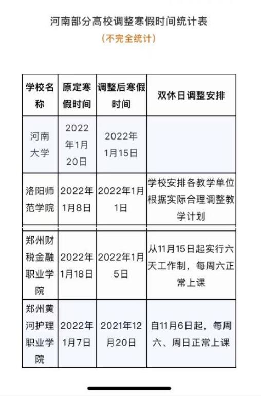 河南部分高校寒假时间调整。 截图取自河南省教育厅微信公众号