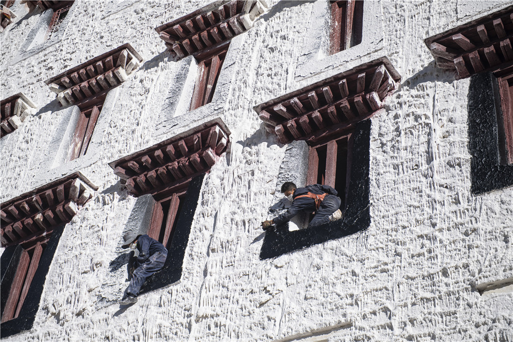 2021年10月21日,工作人员在西藏布达拉宫进行年度粉刷工作。新华社记者 孙瑞博 摄