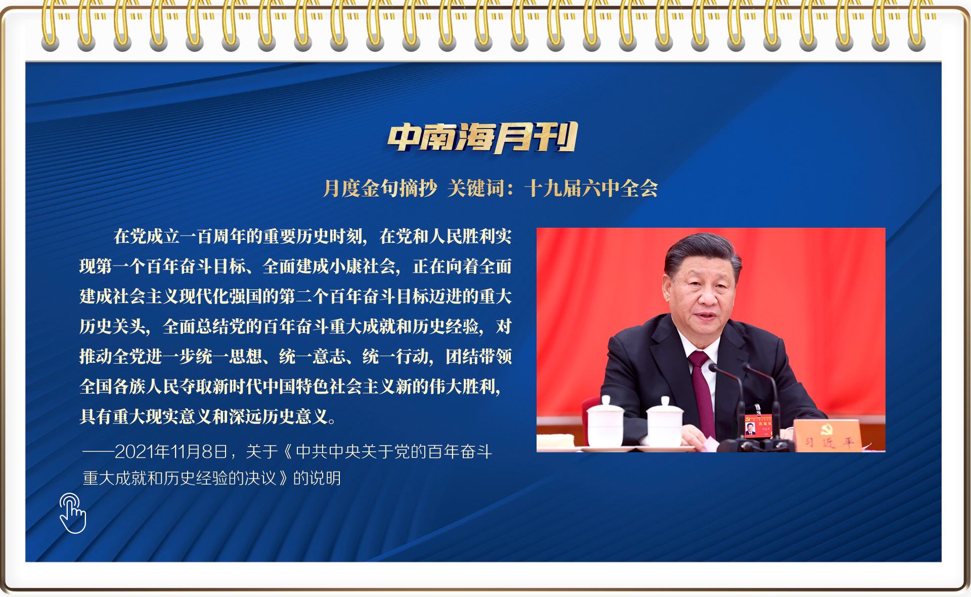 这个月,中国共产党第十九届中央委员会第六次全体会议(以下简称十九届六中全会)在京召开,习近平总书记作重要讲话。全会审议通过了《中共中央关于党的百年奋斗重大成就和历史经验的决议》,《决议》总结了党团结带领人民群众百年奋斗的重大历史成就,凝聚起向第二个百年奋斗目标奋进的强大力量。
