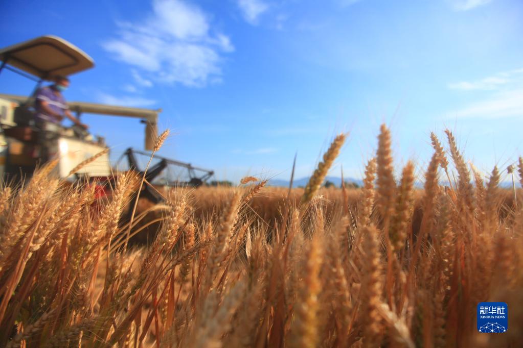 收割机在山东省临沂市平邑县的麦田里收割小麦(6月8日摄)。新华社发(武纪全 摄)