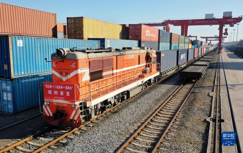 “连云港—二连浩特—莫斯科”中欧班列在江苏连云港中哈物流基地整装待发(11月23日摄,无人机照片)。新华社发(王健民 摄)